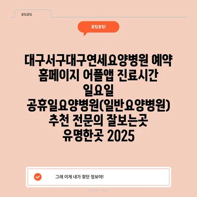대구서구대구연세요양병원 예약 홈페이지 어플앱 진료시간 일요일 공휴일요양병원(일반요양병원) 추천 전연락 잘보는곳 유명한곳 2025 에 대해 자주 묻는 질문 TOP 5