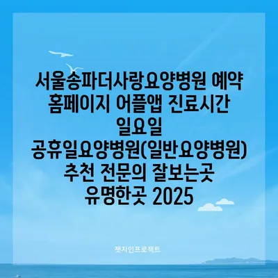 서울송파더사랑요양병원은 예약 홈페이지와 앱을 통해 쉽게 접속할 수 있는 곳입니다. 진료 시간은 일요일 및 공휴일에도 운영되어 환자분들의 편의를 고려했습니다. 이곳은 …