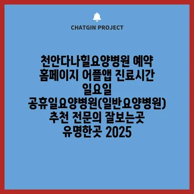 천안다나힐요양병원은 예약이 용이한 홈페이지와 어플앱을 알려드려 진료를 보다 편리하게 받을 수 있습니다. 환자분들을 위한 진료시간은 주중은 물론 일요일과 공휴일에도 운영되고 …