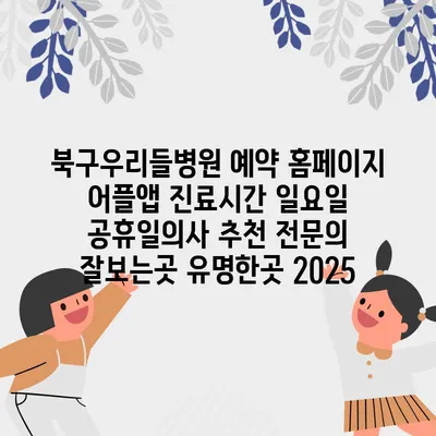 북구우리들병원은 환자 여러분의 편의를 위해 예약 홈페이지와 어플 앱을 운영하고 있습니다. 특히, 진료시간은 월요일부터 토요일까지 운영되며, 일요일과 공휴일에도 진료를 진행하고 …