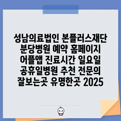 성남의료법인 본플러스재단 분당병원은 예약 홈페이지와 어플앱을 통해 간편하게 진료 예약을 할 수 있는 곳입니다. 진료시간은 평일뿐 아니라 일요일과 공휴일에도 운영되어, …