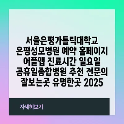 서울은평가톨릭대학교 은평성모병원은 예약 홈페이지와 어플앱을 통해 간편하게 진료를 예약할 수 있습니다. 이 병원은 진료시간이 유연하여, 특히 일요일 및 공휴일에도 진료를 …