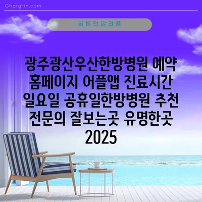 광주광산우산한방병원은 예약 홈페이지와 앱을 편리하게 이용하여 예약할 수 있는 곳입니다. 진료시간은 평일과 토요일, 일요일과 공휴일에도 이용 가능하니, 원하는 날짜에 쉽게 …