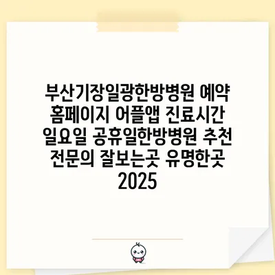 부산기장일광한방병원은 예약 홈페이지와 어플 앱을 통해 쉽고 간편하게 진료를 예약할 수 있습니다. 진료시간은 평일뿐만 아니라 일요일 및 공휴일에도 이용할 수 …