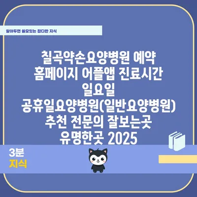 칠곡약손요양병원은 예약 홈페이지와 어플앱을 통해 간편하게 진료를 예약할 수 있는 곳입니다. 특히, 진료시간은 일요일과 공휴일에도 열려 있어 언제든지 필요한 서비스를 …