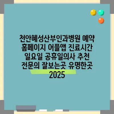 천안혜성산부인과병원은 예약 홈페이지와 어플앱을 통해 간편하게 진료 예약을 할 수 있는 곳입니다. 이 병원은 진료시간이 유연하여 일요일이나 공휴일에도 진료가 가능해 …