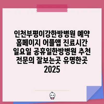 인천부평이강한방병원은 예약 홈페이지와 어플앱을 통해 간편하게 진료를 예약할 수 있는 병원입니다. 이곳은 진료시간이 유연하여, 특히 일요일 및 공휴일에도 진료를 받을 …