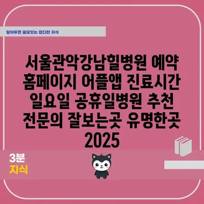 서울관악강남힐병원은 예약 홈페이지와 어플 앱을 통해 손쉽게 진료 예약을 할 수 있는 곳입니다. 이 병원은 일요일과 공휴일에도 운영되어 바쁜 일정을 …