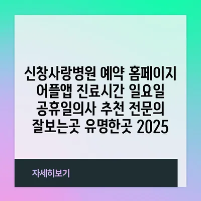 신창사랑병원은 예약 홈페이지와 어플앱을 통해 간편하게 진료를 예약할 수 있는 최고의 의료기관입니다. 병원의 진료시간은 편리하게 설정되어 있으며, 특히 일요일과 공휴일에도 …