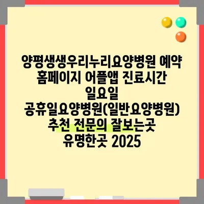 양평생생우리누리요양병원은 2025년에도 많은 환자들에게 사랑받는 요양병원입니다. 이 병원은 예약 홈페이지와 어플앱을 통해 쉽게 예약할 수 있어 편리합니다. 진료시간은 평일과 마찬가지로 …