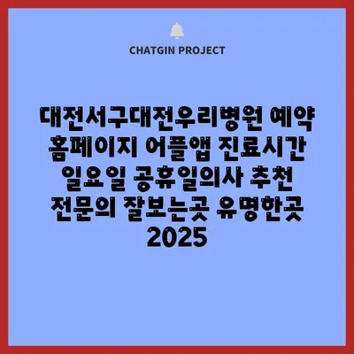 대전서구대전우리병원은 2025년에 새롭게 발전할 예정인 의료기관으로, 예약 홈페이지와 어플앱을 통해 보다 편리한 진료 서비스를 알려알려드리겠습니다. 진료시간은 평일뿐 아니라 일요일과 공휴일에도 …