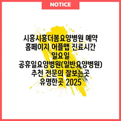시흥시흥더봄요양병원은 예약 홈페이지와 어플앱을 통해 간편하게 진료를 받을 수 있는 장소입니다. 특히, 진료시간은 유연하게 운영되어 일요일과 공휴일에도 이용이 가능하여 바쁜 …