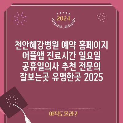천안혜강병원은 2025년을 맞아 더욱 향상된 서비스를 제공하는 대표적인 의료기관입니다. 예약은 홈페이지와 어플앱을 통해 간편하게 할 수 있으며, 언제든지 필요한 진료를 …